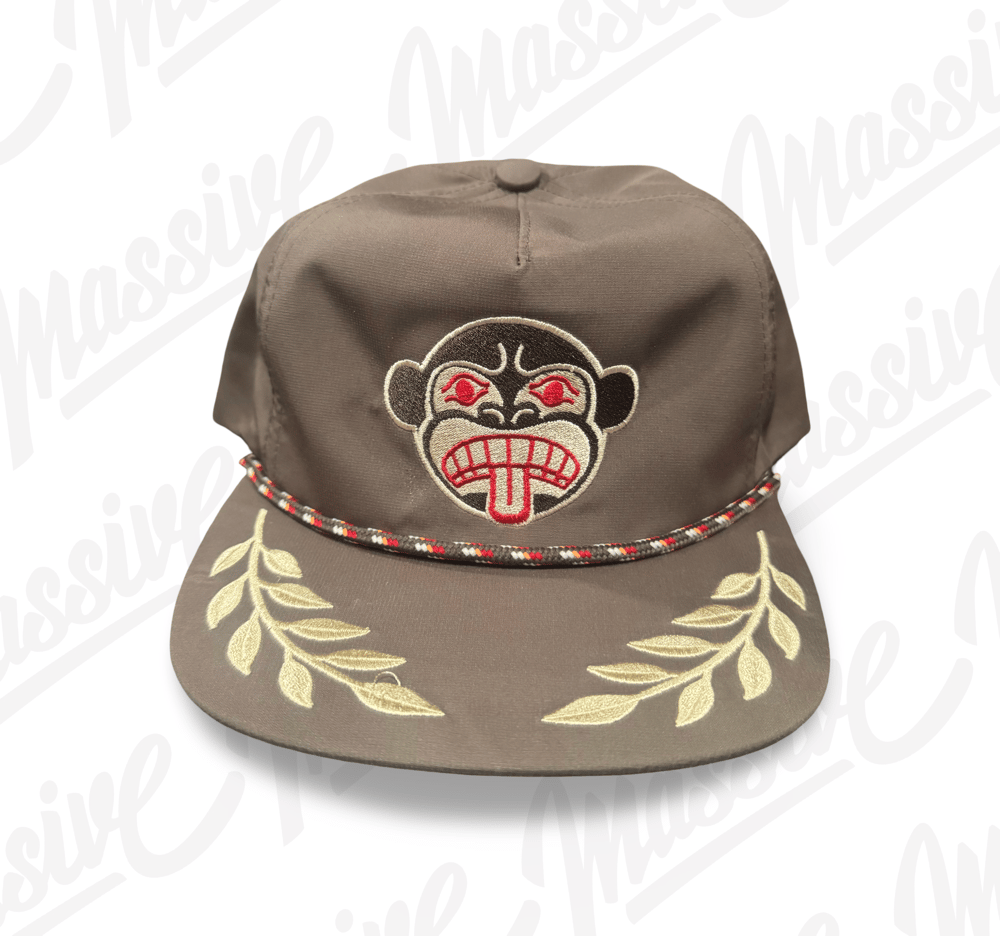 A statement piece that blends culture, craftsmanship, and attitude. The Massive Monkee Bay Leaf Hat features the signature Monkee Head embroidered across the crown, detailed with red eyes and tongue for a bold contrast. Embroidered bay leaf motifs wrap the visor, symbolizing victory, growth, and legacy.