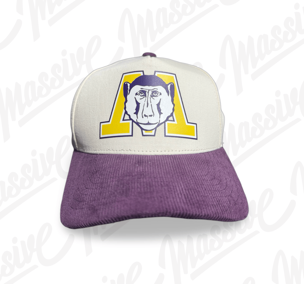 • Cream crown with a bold yellow “M” and baboon face graphic — repping team spirit with Monkee character.